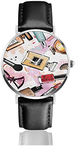 Girly cosmetic and make up theme pattern with perfume and lipstick nail polish brush modern city black quartz movement stainless steel leather strap watches casual fashion wrist watches