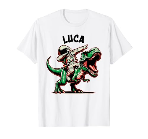 Luca dabbing astronaute sur un dessin animé dinosaure t-shirt