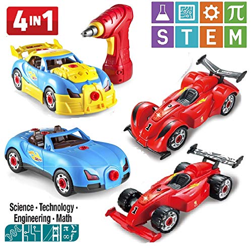 4 in 1 build your own racer car set stem toy with real working drill and screws 53 piece take-a-part toy for boys and girls with lights and sounds