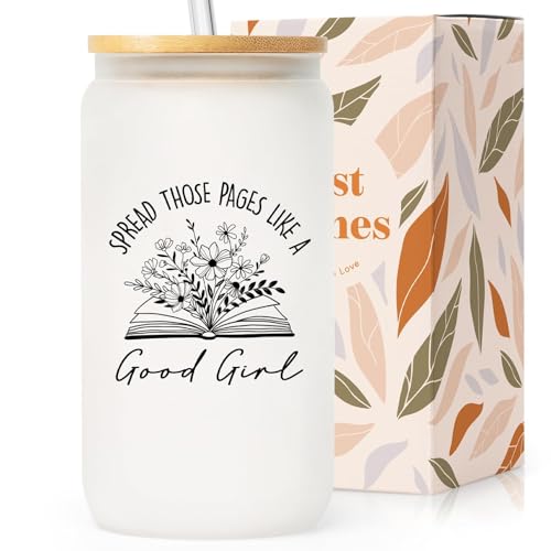 16oz glass cups with lid & straw birthday bookish presents for readers librarian bookworm reading accessories & book club gifts