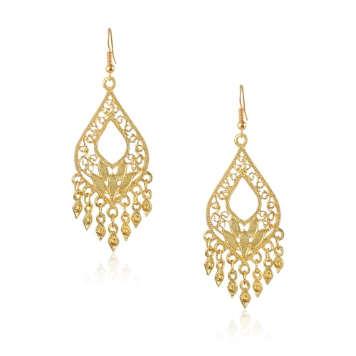 Right now the seller who has availability to buy 14k gold plated teardrop dangly earrings for women intricate filigree chandelier design with dangling tassel accents is Amazon