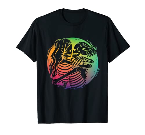 Lesbian couple lgbtq pride rainbow flag skeletons kissing t-shirt