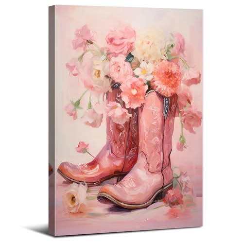 Pink cowgirl wall art floral wall decor preppy cowgirls boots decor for girls bedroom retro western preppy posters aesthetic flowers prints trendy artwork for teen girls room dorm decoration 30x40cm