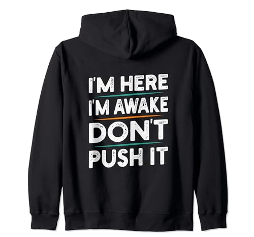 The sale price of Funny sarcastic quote saying motivation i'm here i'm awake zip hoodie has remained stable at in recent times, there has been no change. As for offers on this product from im-here-im-awake-dont-push-it-cool-joke-humor, the price of is similar in all stores in the network, without major differences.