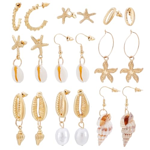Ph pandahall 9 pairs seashell earrings starfish earring golden ocean earrings set summer jewellery for women beach party vacation summer themed pendant earring ear studs 0.55~2.1 inch
