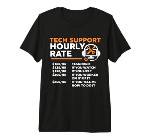 The sale price of Tech support hourly rate it engineer tech computer geek premium t-shirt has remained stable at in recent times, there has been no change. As for offers on this product from tech-support-hourly-rate-it-engineer-gift, the price of is similar in all stores in the network, without major differences.