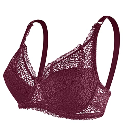 Women's plunge lace bra plus size sexy see through underwired non padded steel rings bra burgundy 38d
