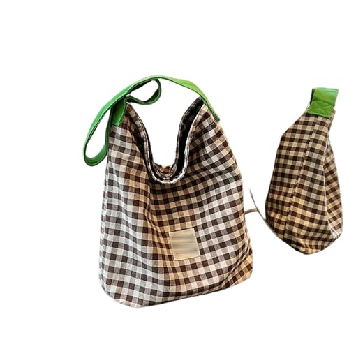 Tote women's canvas bucket bag contrast color plaid single shoulder fabric bag-coffee
