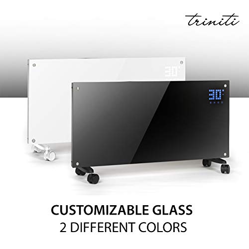 Pannello termoconvettore riscaldamento elettrico triniti radiatore in vetro a convezione 1000-2000 w display touch telecomando 2 regolazioni timer 24 h antischizzi ip24 montaggio a parete vetro bianco