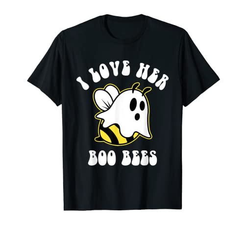 Divertido disfraz de halloween i love her boo bees perezoso camiseta