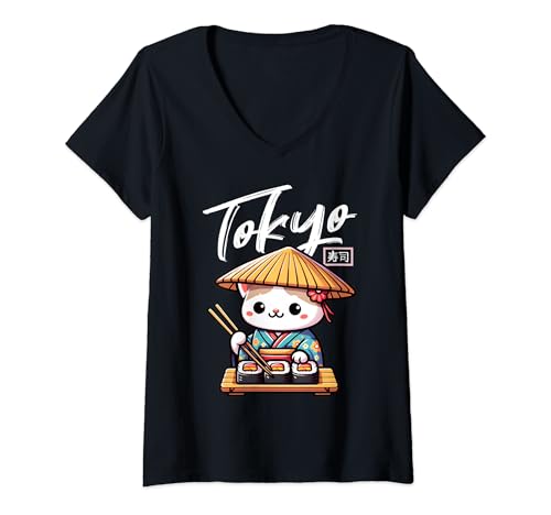 Mujer sushi gato kawaii japonés harajuku anime tokio gato sushi camiseta cuello v