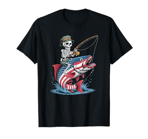 Halloween skeleton fishing patriotic american flag camiseta