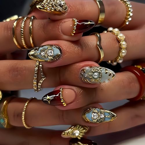 Mandel press on uñas medium uñas artificiales oro con diseños de charm de estrass y oro french tip brillantes pegatinas de uñas para mujeres 24