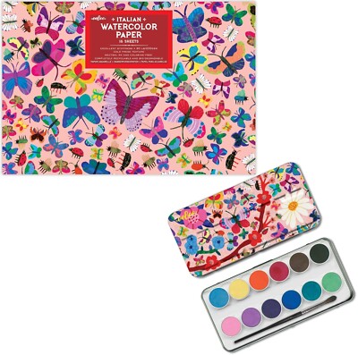 Eeboo lot boite fer métal aquarelle +bloc papier 16 feuilles motif papillons
