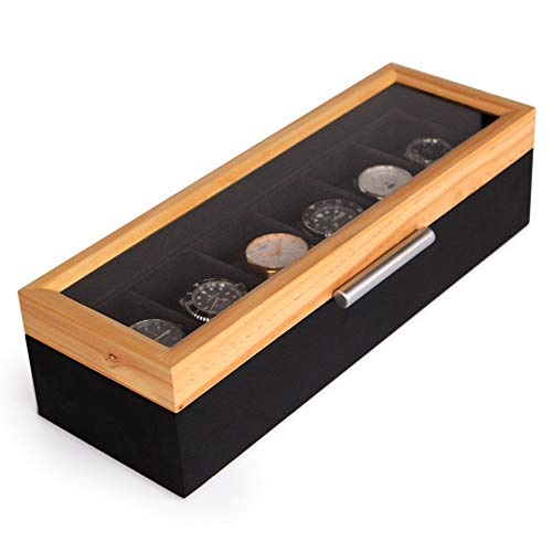 Ahora mismo el vendedor que tiene disponibilidad para comprar Modern two-toned pine and dark gray with aluminum handle 6-slot watch box with real glass by case elegance es Amazon