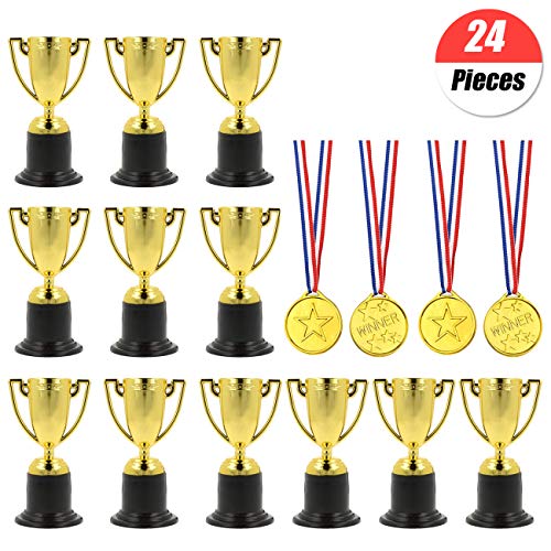 24 piezas de trofeos de medallas set,12 x mini trofeo de plástico de oro,12 x medallas ganadoras para favores adornos de fiesta