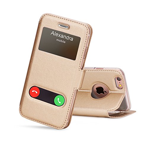• De soporte magnetico en la parte cubierta y funcion de ventana con vista a pantalla superior para apple iphone 6/6s dorado