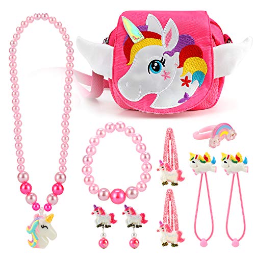 Unicornio niñas bolso joyas collar pulsera anillo pendientes gomas del pelo pinza set