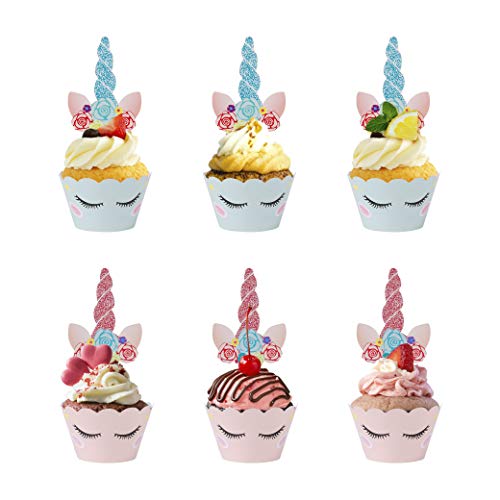 Unicorn cupcake toppers magdalenas decoración y doble cara cupcake wrappers para unicornio fiesta tarta de cumpleaños decoraciones baby shower y boda 24 piezas