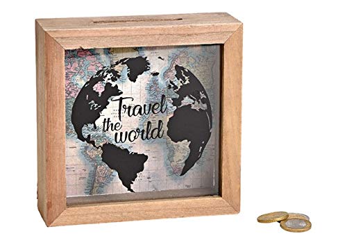 Hucha con forma de taza de viaje y texto en inglés travel the world urlaubtes