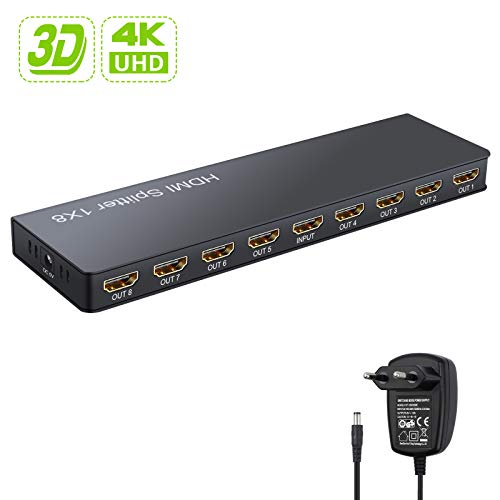 Hdmi splitter 1 entrada 8 salidas duplicador hdmi distribuidor hdmi divisor 4k 30hz compatible con uhd 1080p 3d hdcp 1.2 con adaptador de corriente 5v 1a para portatil ps3 roku blu-ray hdtv