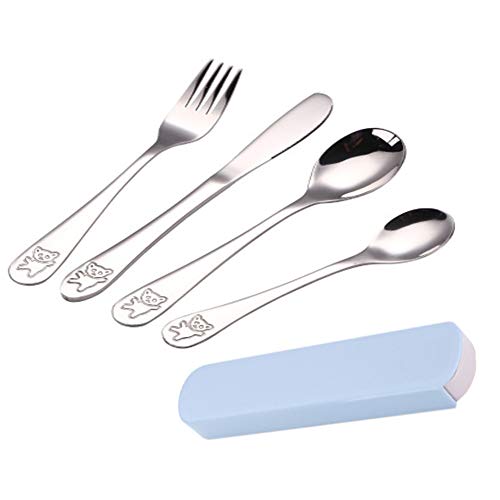 Juego de cubiertos de acero inoxidable con diseño de oso de dibujos animados de 4 piezas con estuche portátil